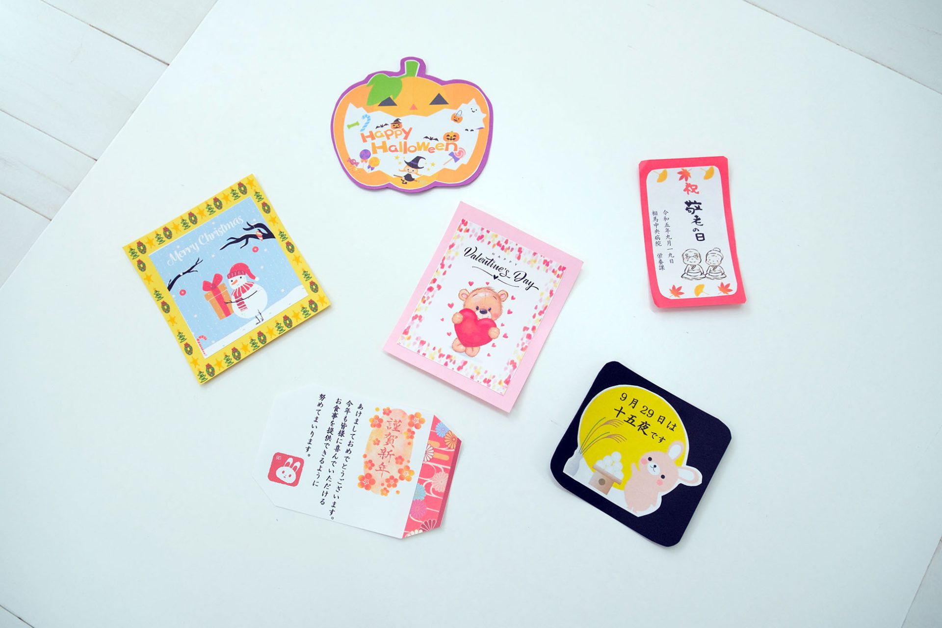 当院では、食事の栄養面や衛生面などの管理を徹底することは当然ですが、それ以上に「たべる事はたのしいこと」の考えのもと、四季折々の季節感や、楽しいイベントに合った食事を、メッセージカードを添えて提供しています。
