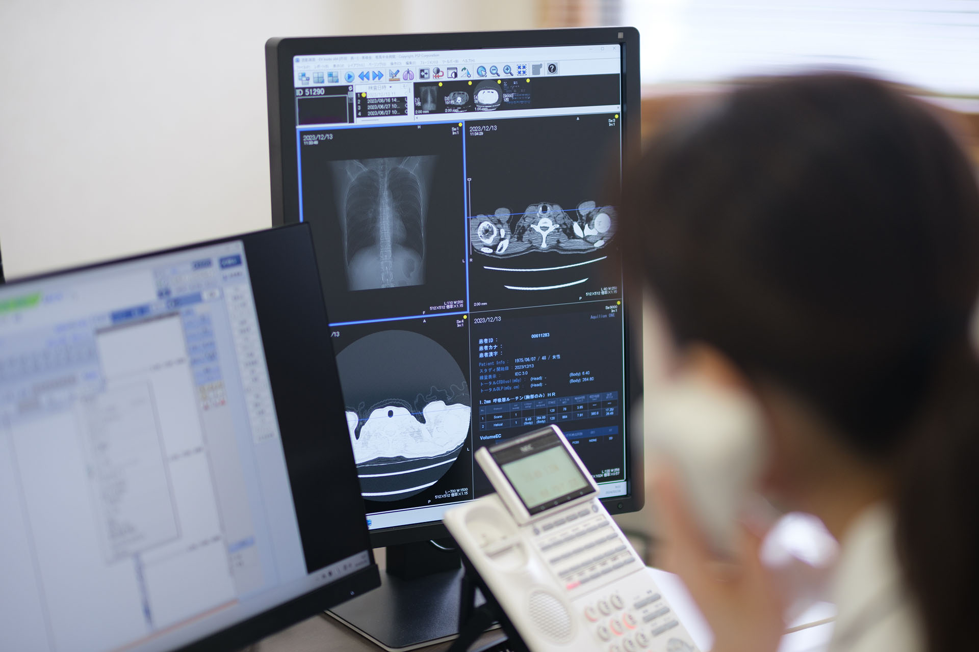 CT・MRIなど画像診断機器のめざましい進歩により、現在の診療における画像診断の役割は大きく、診療の柱となっています。当院放射線科では、一般撮影(CR)や透視検査・CT・MRIなどの撮影・撮像、骨粗しょう症のための骨塩定量検査を行っています。また、放射線医療機器は、患者さまの被ばく低減及び高画質を基本に装置を選定しております。