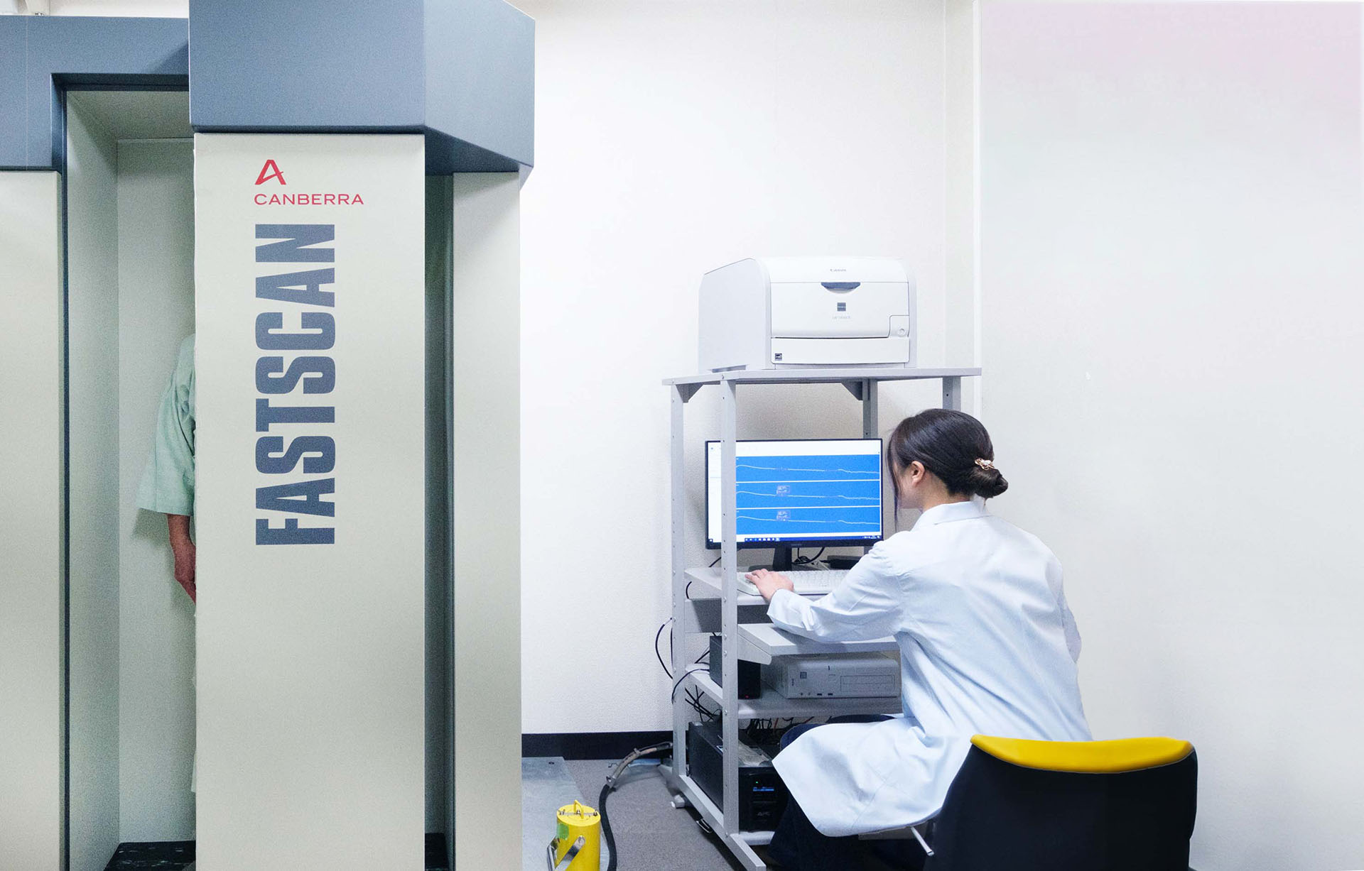 放射線対策室では、ホールボディカウンターという装置を用い、体内の放射性セシウムが出す放射線(ガンマ線)を測定して、内部被ばくの有無をチェックすることができます。検査時間は1人当たり5分です。年に一度は検査を受けましょう。