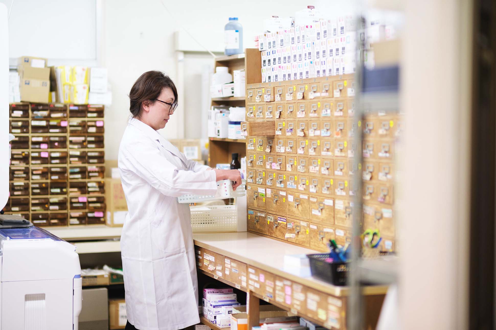 また、医師の指示のもと、内視鏡の検査薬、抗生物質の点眼剤など様々な薬剤を院内で調剤しています。