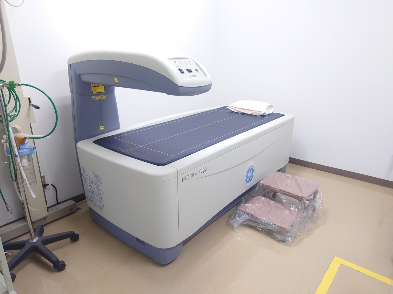 腰椎や股関節の骨塩量(骨の密度)を定量的に測定します。誤差が少なく、短時間で測定でき、放射線の被ばく量も少ないという利点がある二重X線エネルギーを用いるDEXA(Dual Energy X-ray Absorptiometry)法で撮影しています。DEXA法は骨量測定の標準方法として重視され、骨粗しょう症の精密検査や、骨粗しょう症の治療効果の経過観察、また骨折の危険性予測に有用なものとなっています。